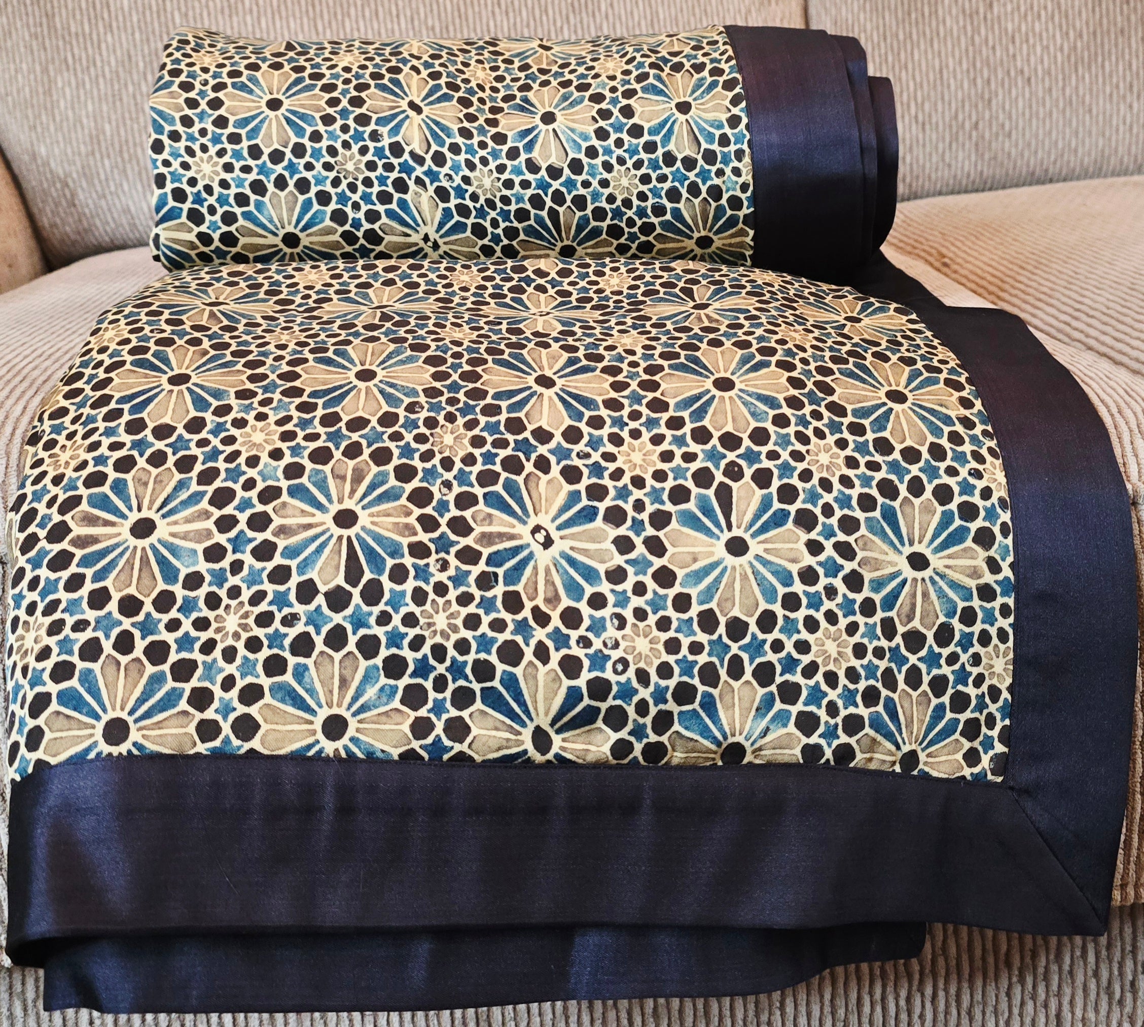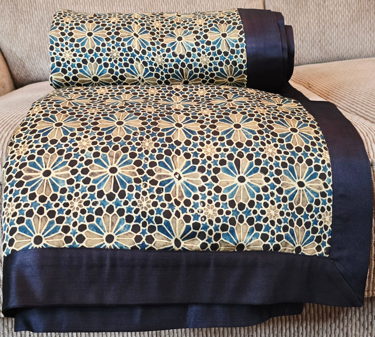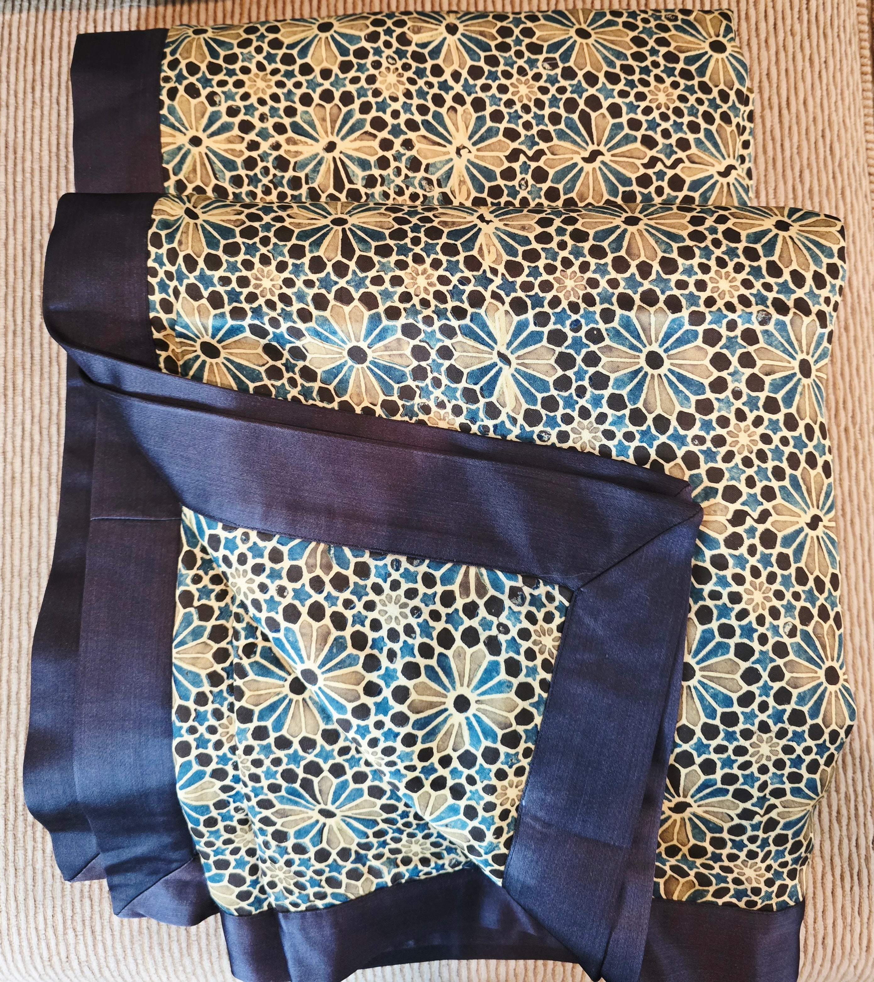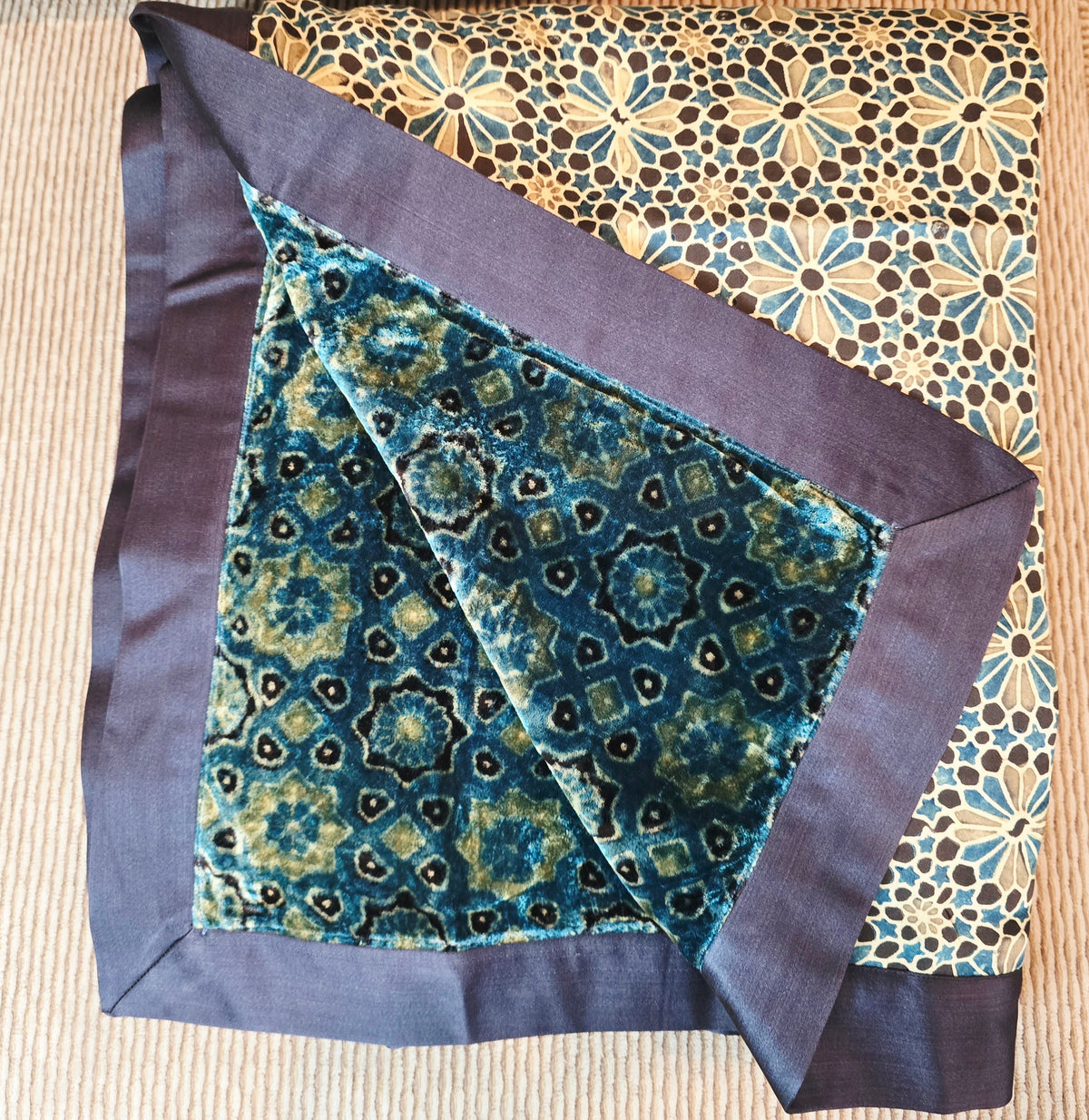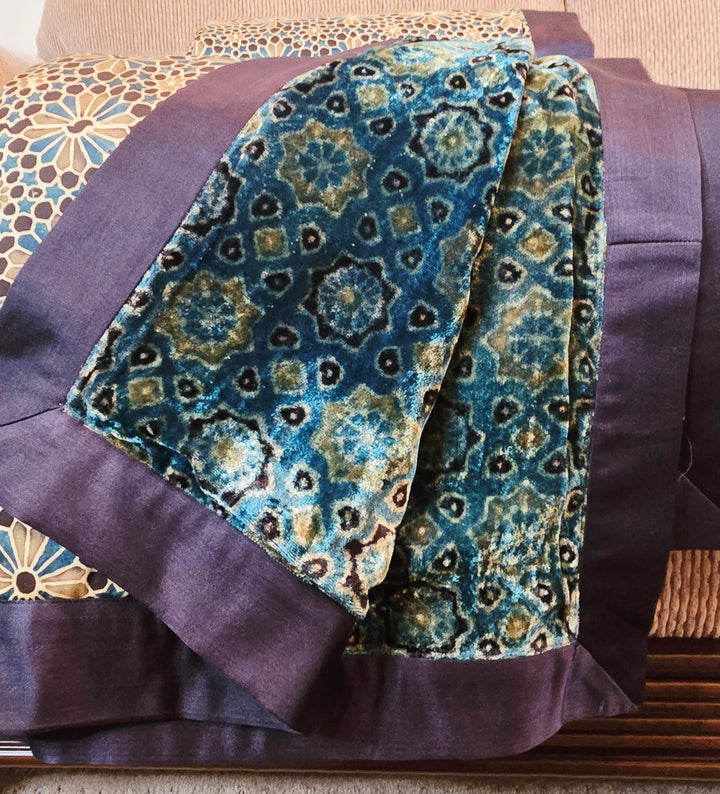 Inspired by the enchanting fusion of handmade artistry and nature, this piece showcases exquisite craftsmanship and thoughtful design. The front features an Ajrakh print on pure silk, while the reverse is adorned with a hand block print on silk velvet. Minor variations in color and print are intrinsic to the handcrafted process, adding unique character and charm to each piece.
