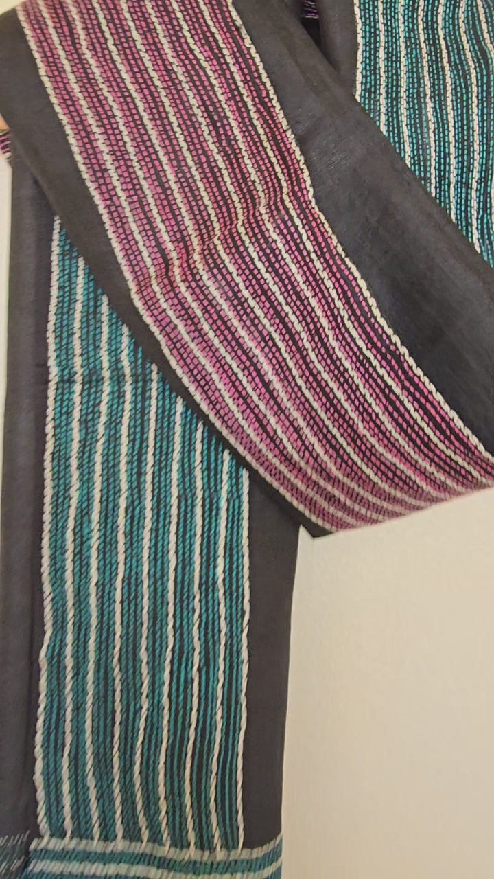Hand Embroidered Kantha Silk Scarf - Pink Green Border
