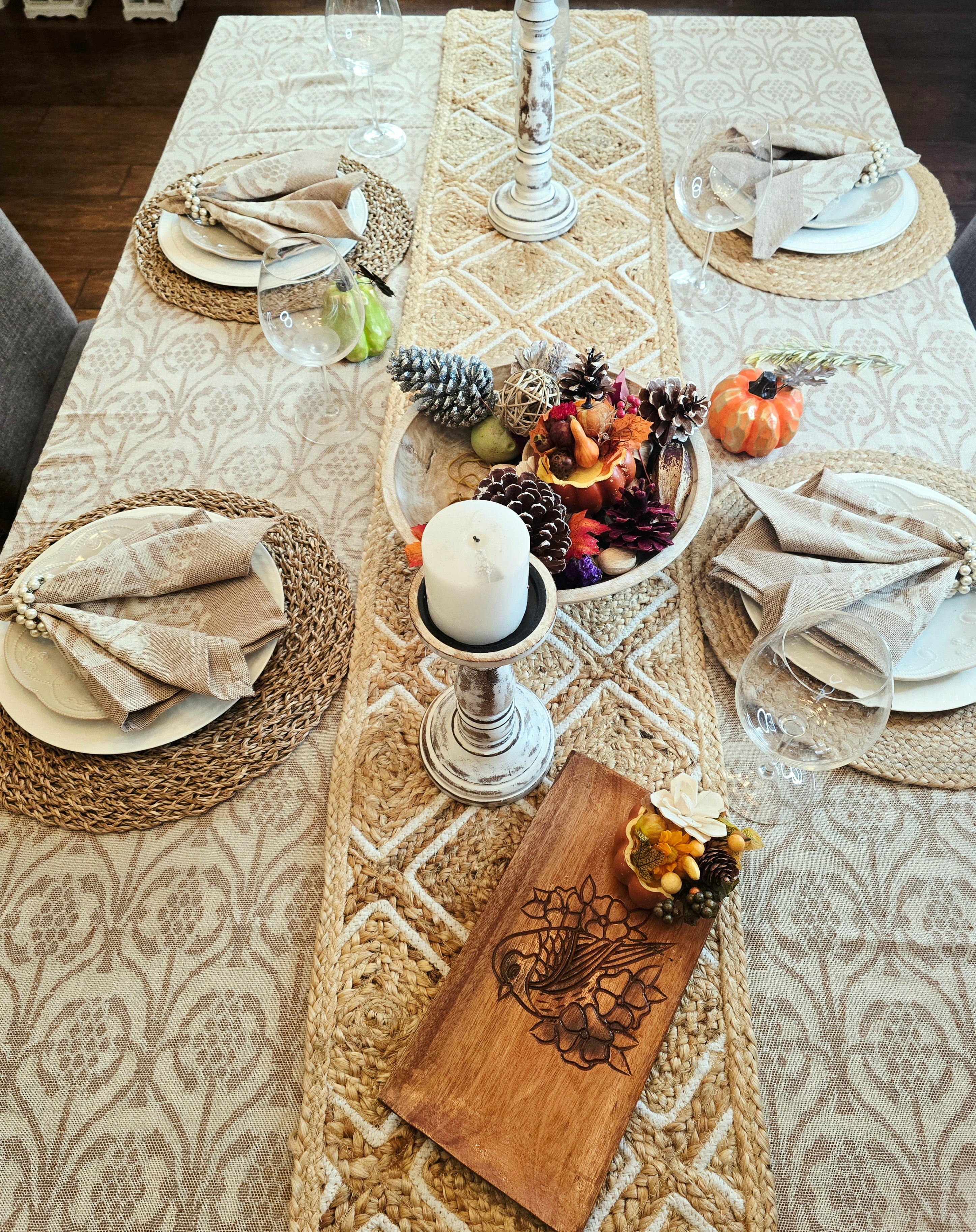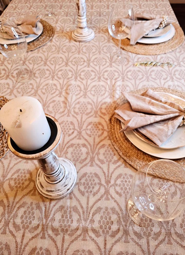 Handwoven by skilled artisans on traditional jacquard looms, this tablecloth brings elegance, softness, and a touch of soul to your everyday rituals. Its rich texture and refined weave effortlessly elevate any table, whether for casual family meals or festive gatherings. The set includes 1 tablecloth, available in two colors, designed in neutral earthy tones to complement any setting. Handwoven in small, ethically crafted batches, each piece reflects thoughtful craftsmanship and sustainable practices.