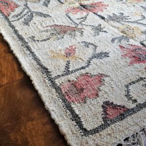 This handmade rug features a vibrant multi-color floral pattern, adding charm and character to any space. Crafted using the flat weave technique, it is lightweight, durable, and reversible, making it suitable for both indoor and outdoor use. For added safety, a non-slip backing is recommended. As with all handmade products, slight variations in color and dimensions are natural and enhance the uniqueness of each piece. Customization for size and color is also available upon request.