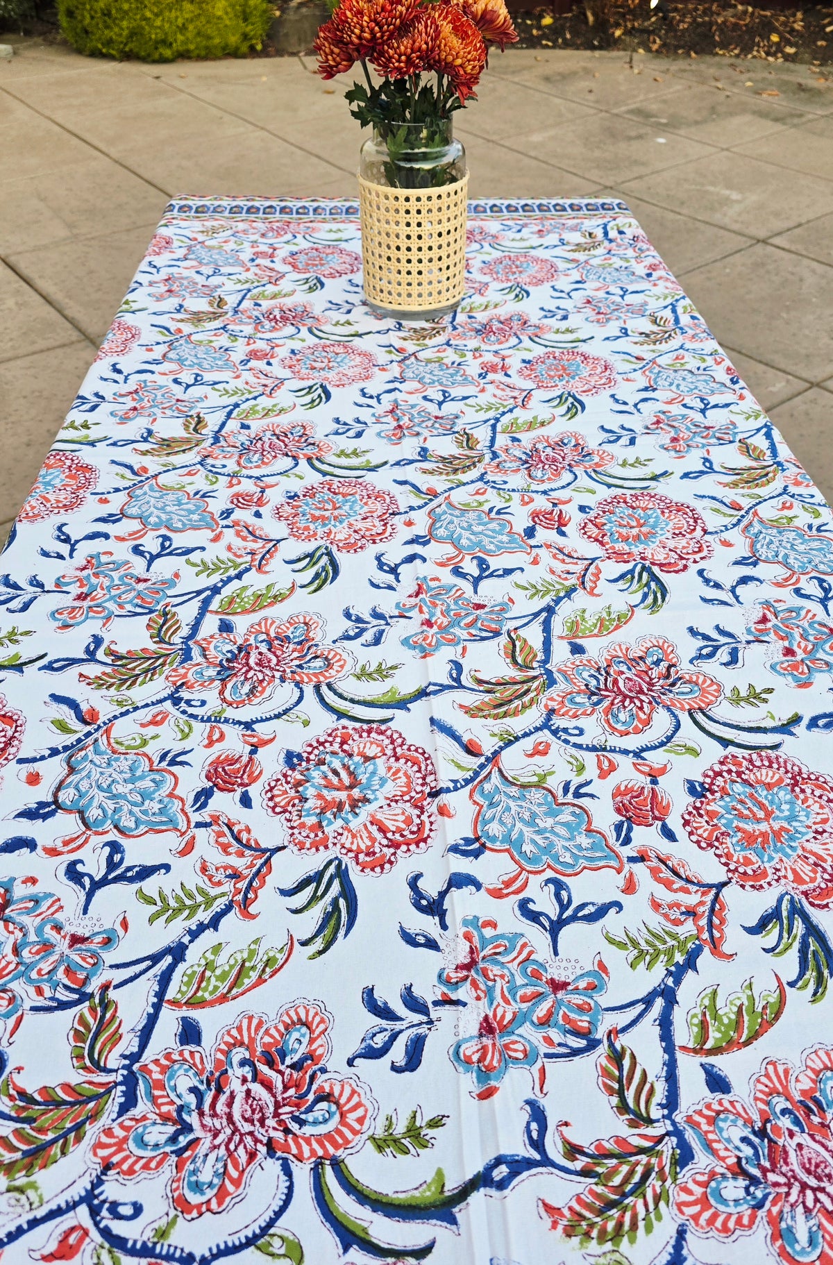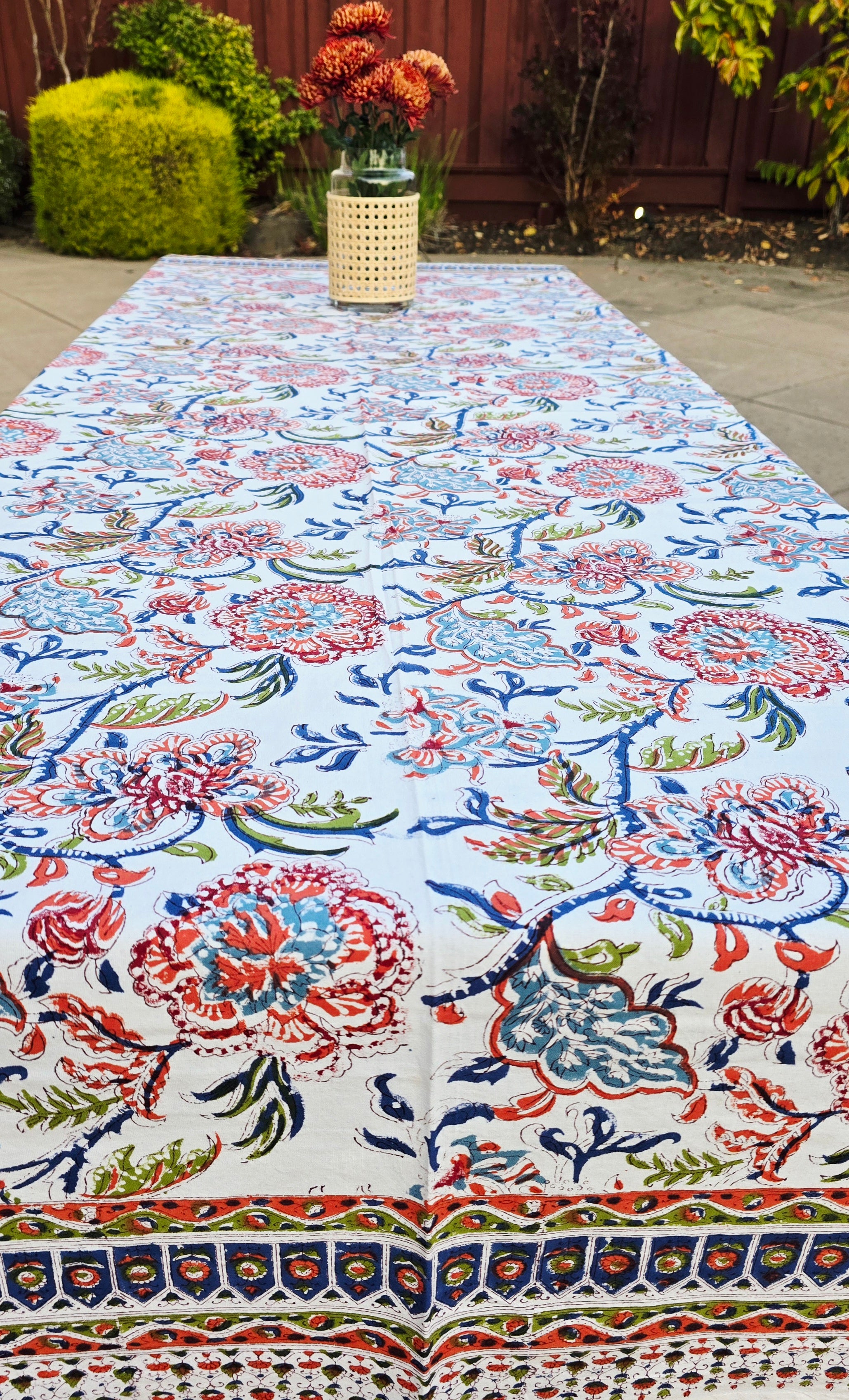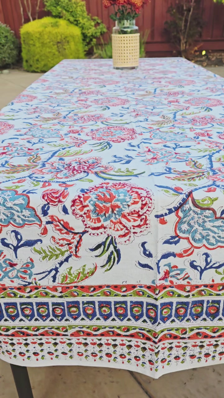 Inspired by the vibrancy of nature, this floral hand block printed tablecloth brings a burst of color to any setting. Crafted with traditional wooden blocks and natural dyes, each piece is handmade by skilled artisans. Made from 100% pure, breathable cotton, it’s both beautiful and functional.