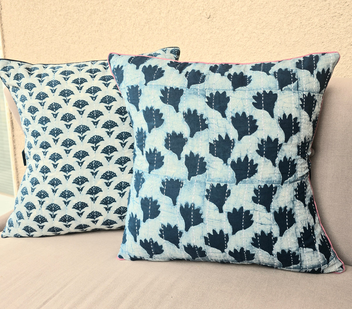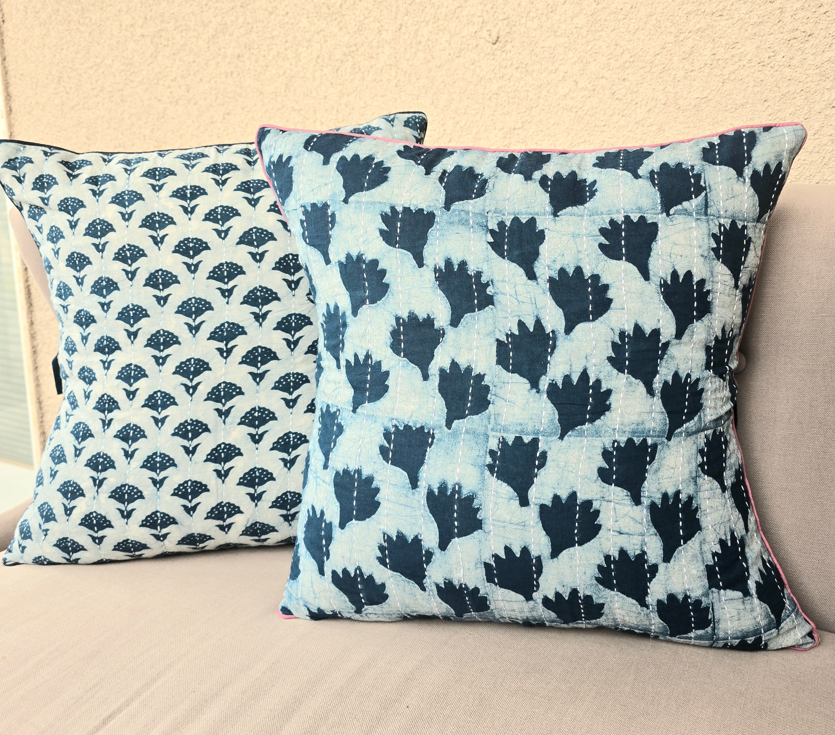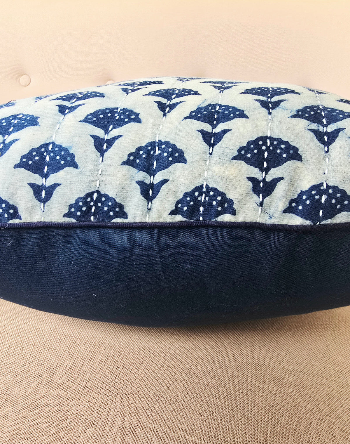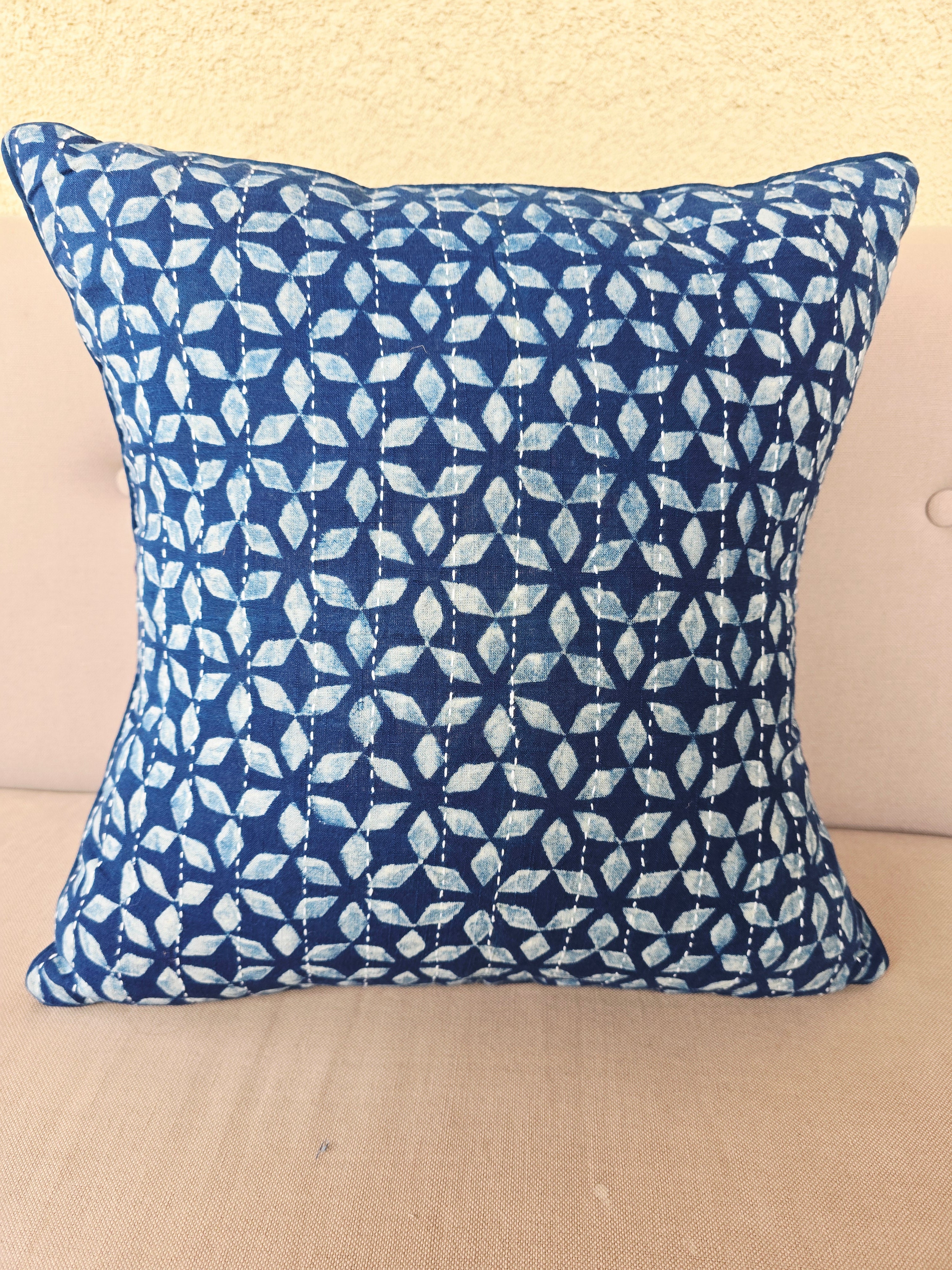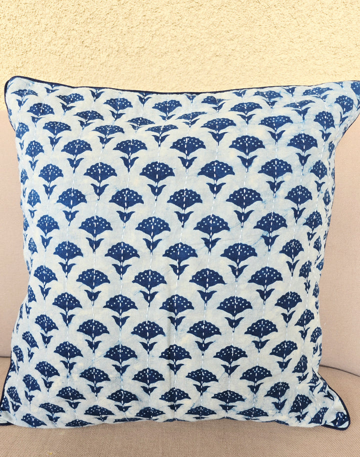 This cushion cover made from 100% breathable cotton fabric, features a vibrant indigo that is beautifully accented with Kantha-style embroidery. The fabric is Hand-dyed in small batches using traditional indigo techniques.