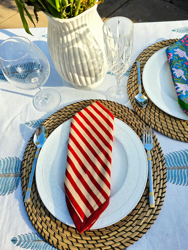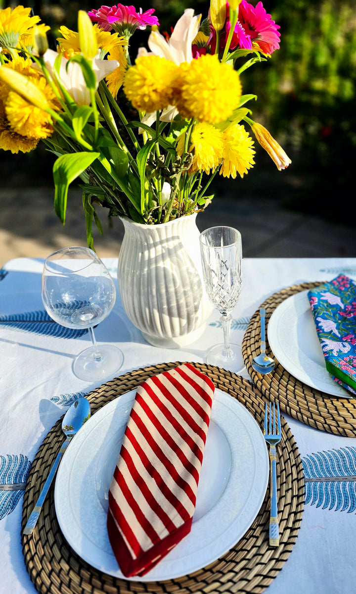 Elevate your everyday meals with our hand-crafted cotton table napkins, where slow craft meets timeless style. Each napkin is a labor of love, made using hand-carved wooden blocks and natural dyes by skilled artisans. Crafted from 100% pure, breathable cotton, these napkins are available in sets of 4 and 6, combining functionality with artisanal beauty.