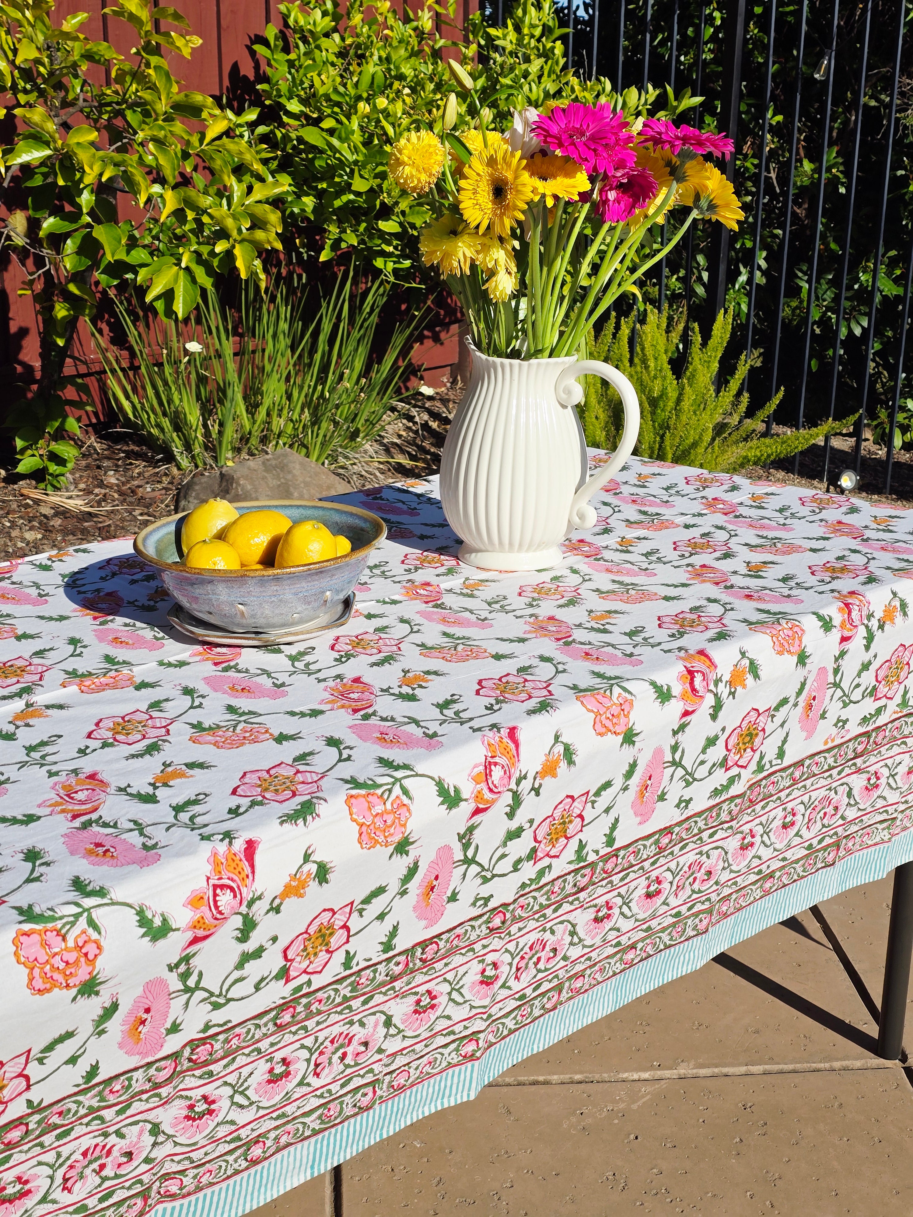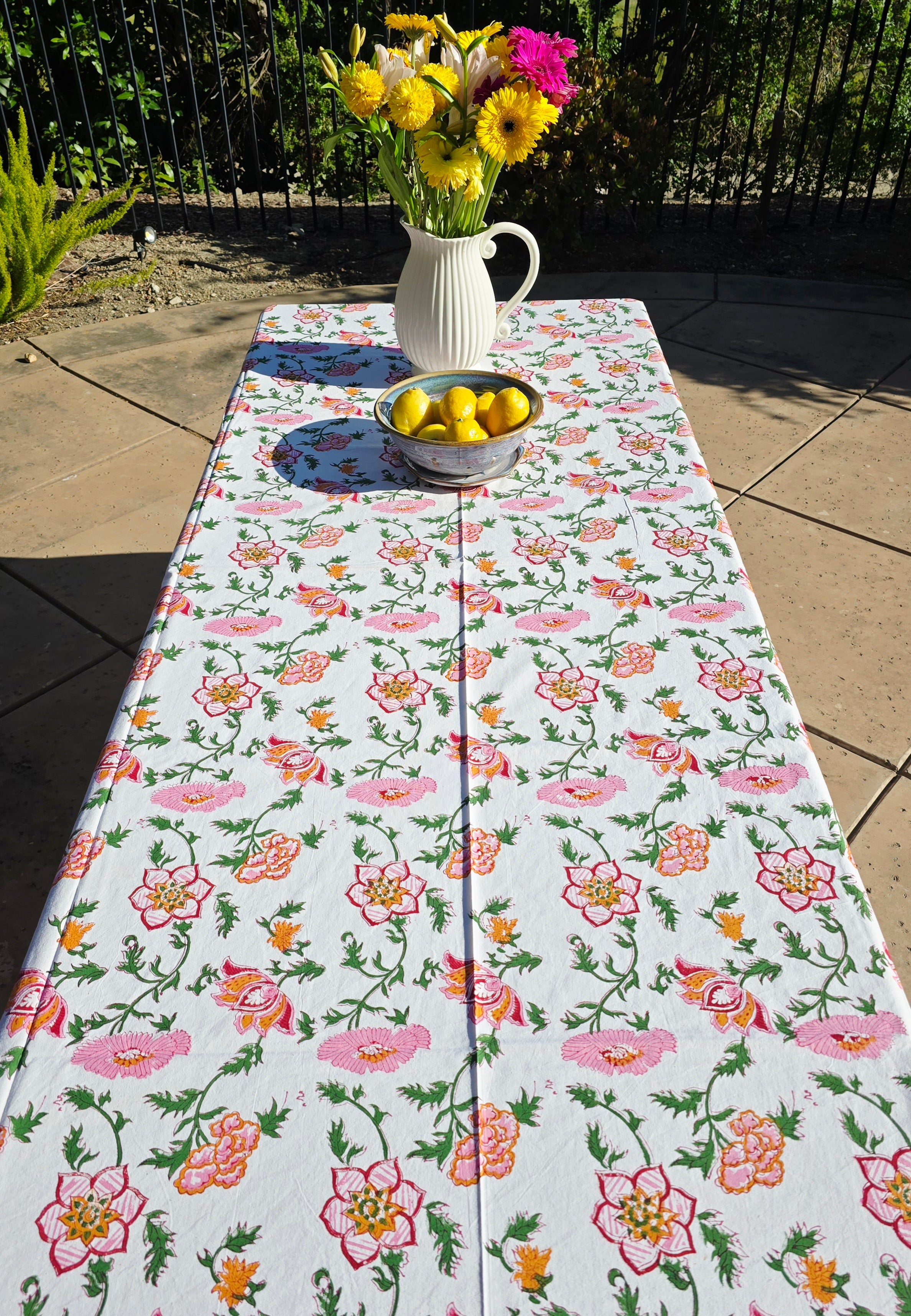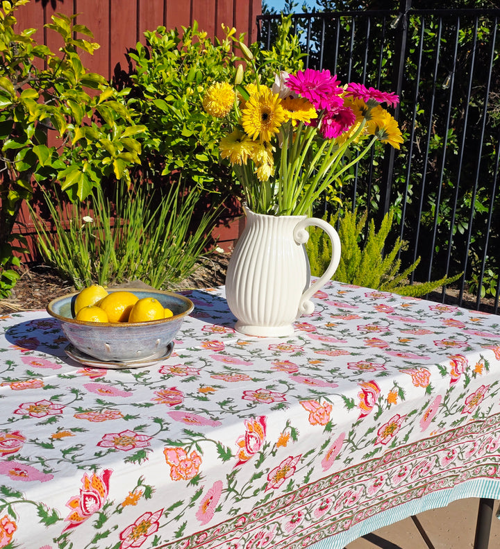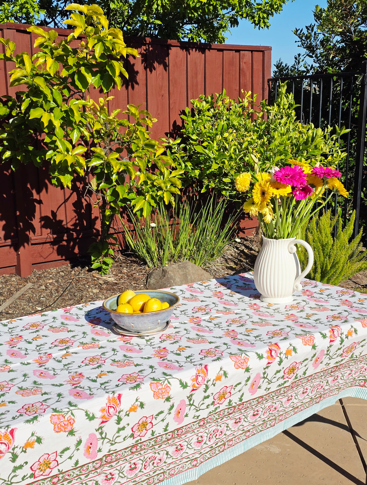 Inspired by the vibrancy of nature, this floral hand block printed tablecloth brings a burst of color to any setting. Crafted with traditional wooden blocks and natural dyes, each piece is handmade by skilled artisans. Made from 100% pure, breathable cotton, it’s both beautiful and functional.