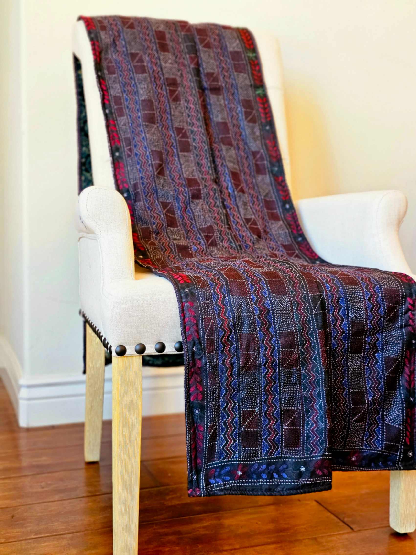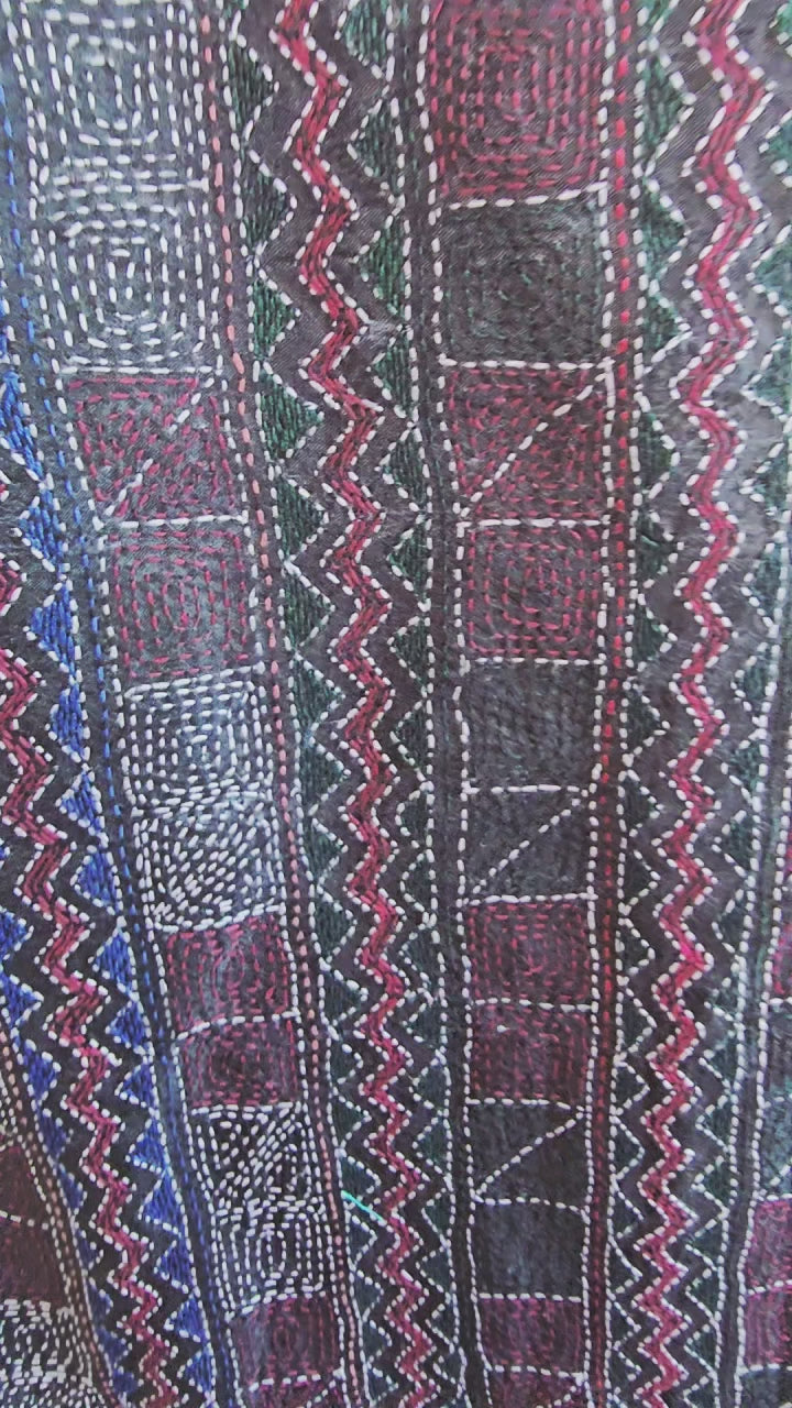 Inspired by the harmonious fusion of handmade artistry and nature, this piece captures the essence of seasonal beauty. The front features handmade Kantha art on silk, reflecting motifs inspired by blooming seasons, while the reverse showcases a hand block print on pure silk velvet. Minor variations in color and print are a natural outcome of the handcrafted process, enhancing the uniqueness and charm of each piece.