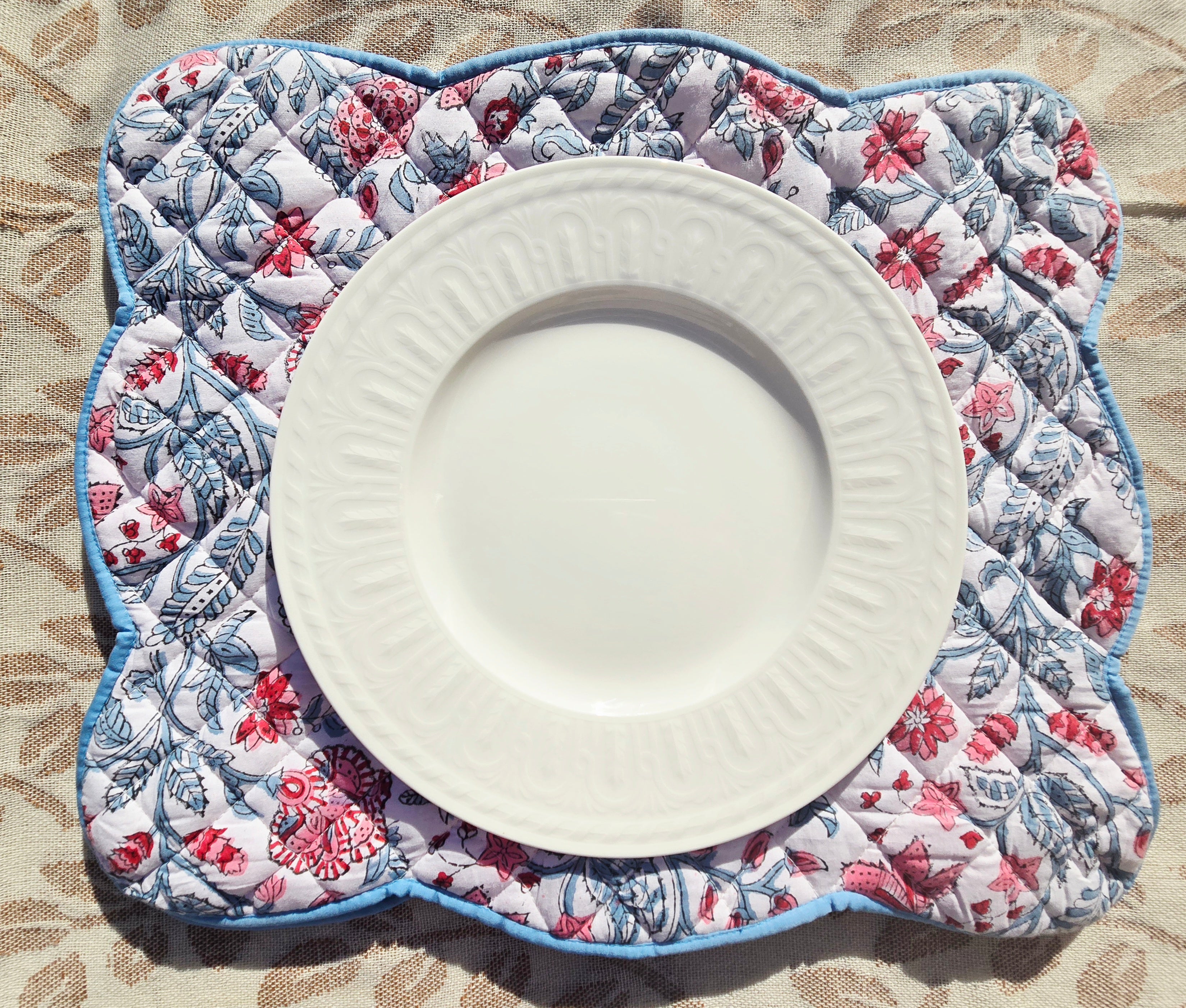 White Floral Block Print Cotton Quilted Placemat with Scalloped Sides